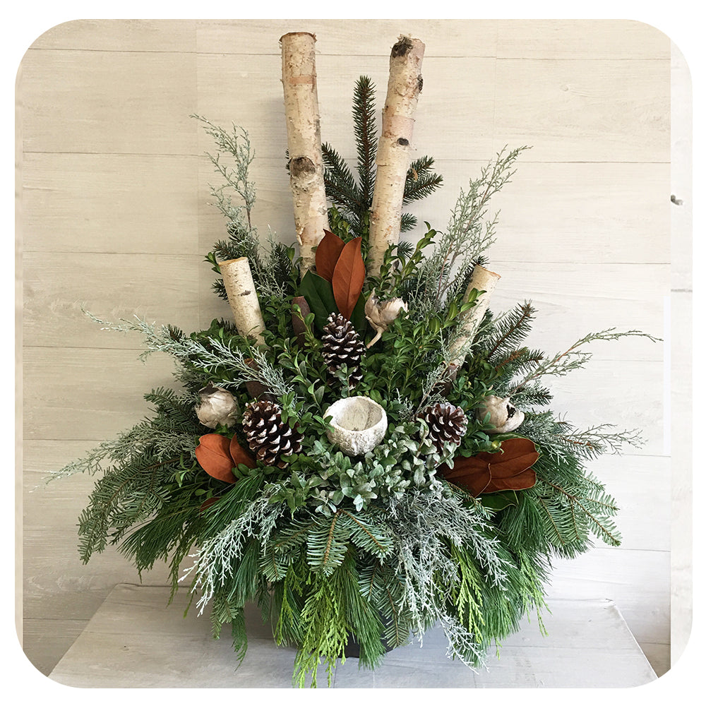 Fresh mixed evergreens and decor, made in house by our team of designers.