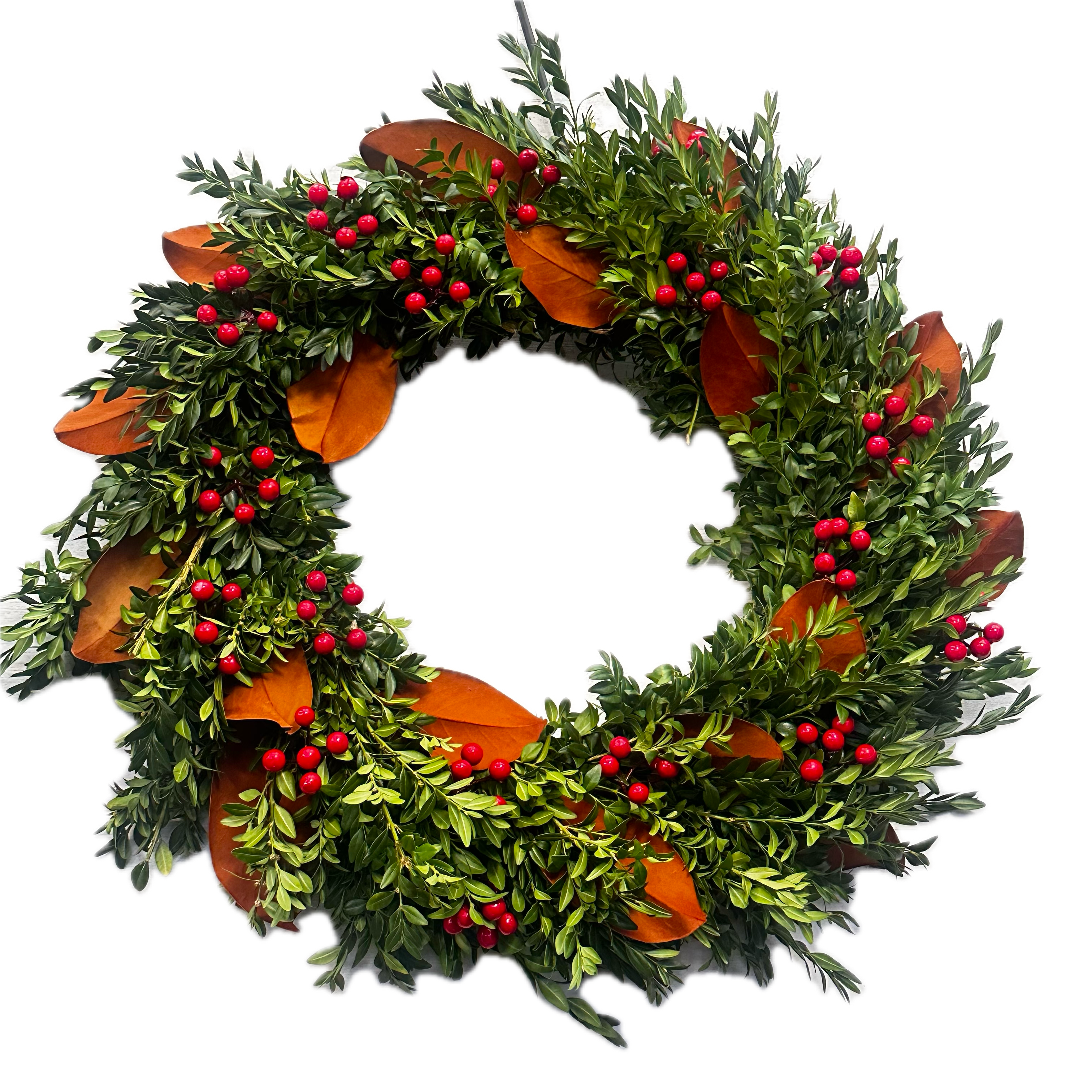 Fresh boxwood wreath decorated with magnolia leaves and faux red berries