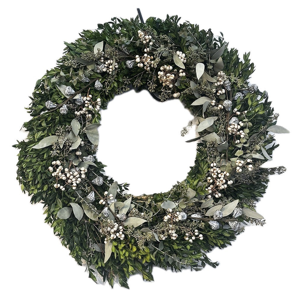 Fresh boxwood wreath decorated with seeded eucalyptus, eucalyptus pods and tallow berries; all natural - NO faux.